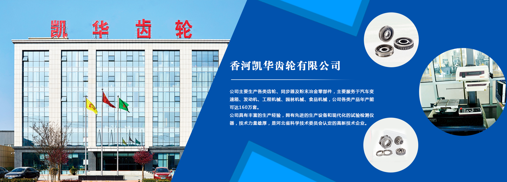 香河凯华齿轮有限公司是一家民营企业,位于香河经济开发区,毗邻京津,交通便利。公司占地面积7万平米,注册资本1360万元,现有员工400余人,其中技术质量工程人员70余名,拥有中高级职称人员30余名。公司主要生产各类齿轮、同步器及粉末冶金零部件,主要适配汽车变速箱与发动机,公司各类产品年产能可达160万套。